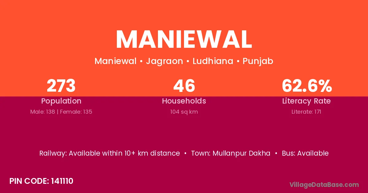 Maniewal village has a total population of 273 people, of which 138 are males and 135 are females.