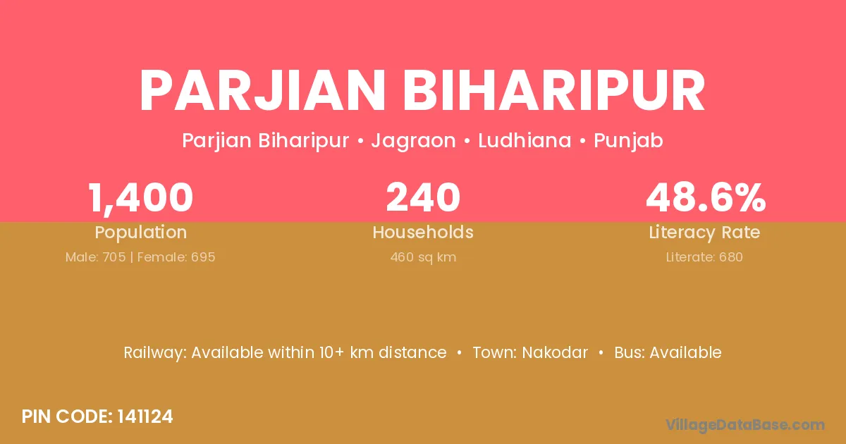 Parjian Biharipur village has a total population of 1,400 people, of which 705 are males and 695 are females.