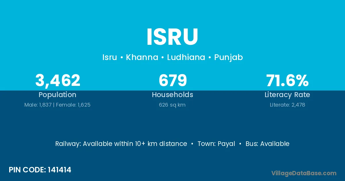 Isru village has a total population of 3,462 people, of which 1,837 are males and 1,625 are females.