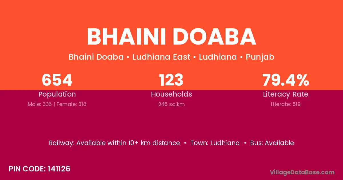 Bhaini Doaba village has a total population of 654 people, of which 336 are males and 318 are females.