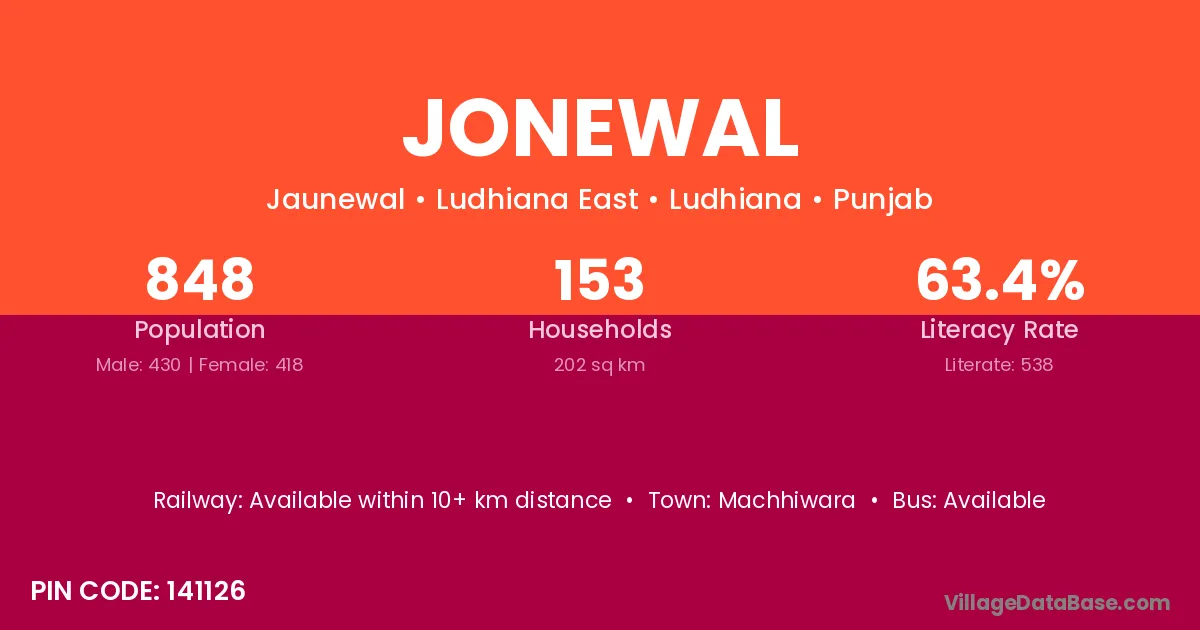 Jonewal village has a total population of 848 people, of which 430 are males and 418 are females.