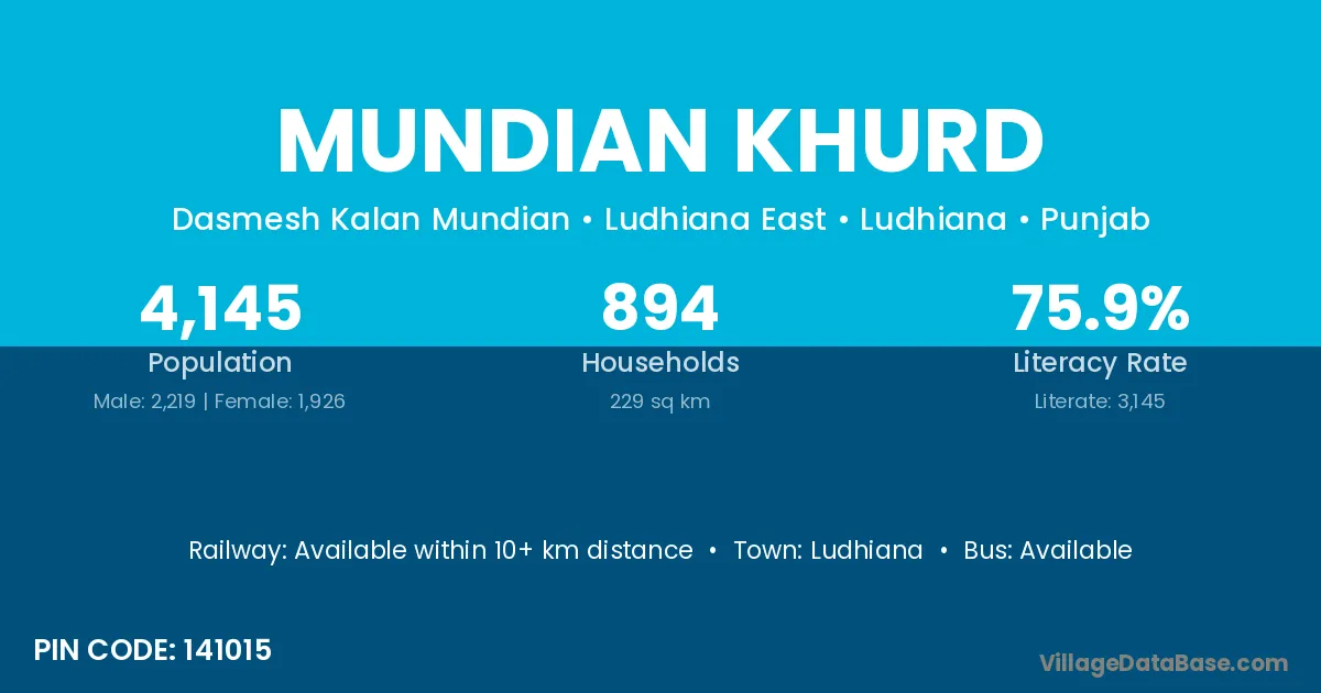 Mundian Khurd village has a total population of 4,145 people, of which 2,219 are males and 1,926 are females.