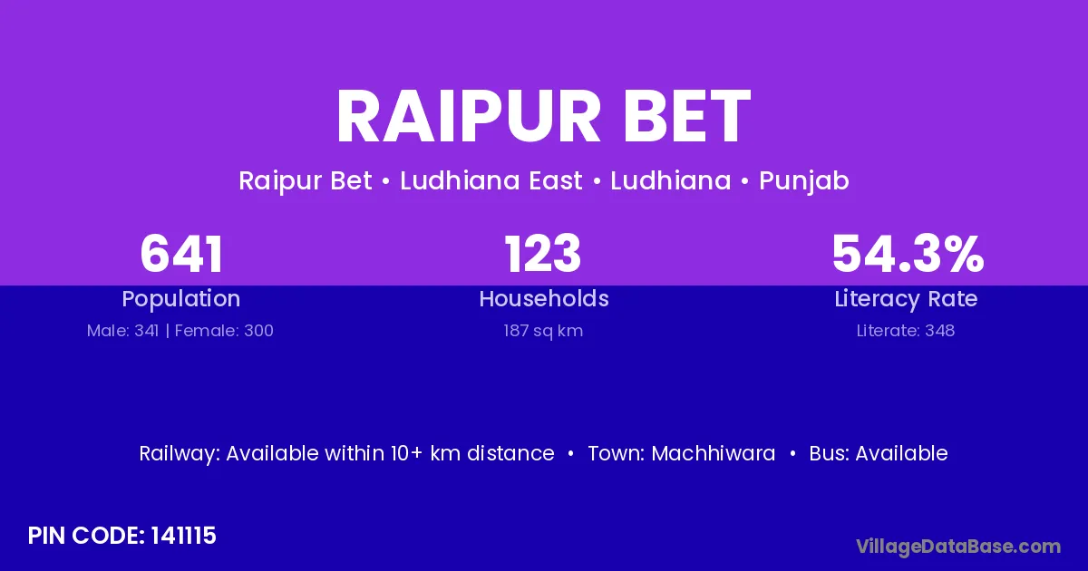 Raipur Bet village has a total population of 641 people, of which 341 are males and 300 are females.