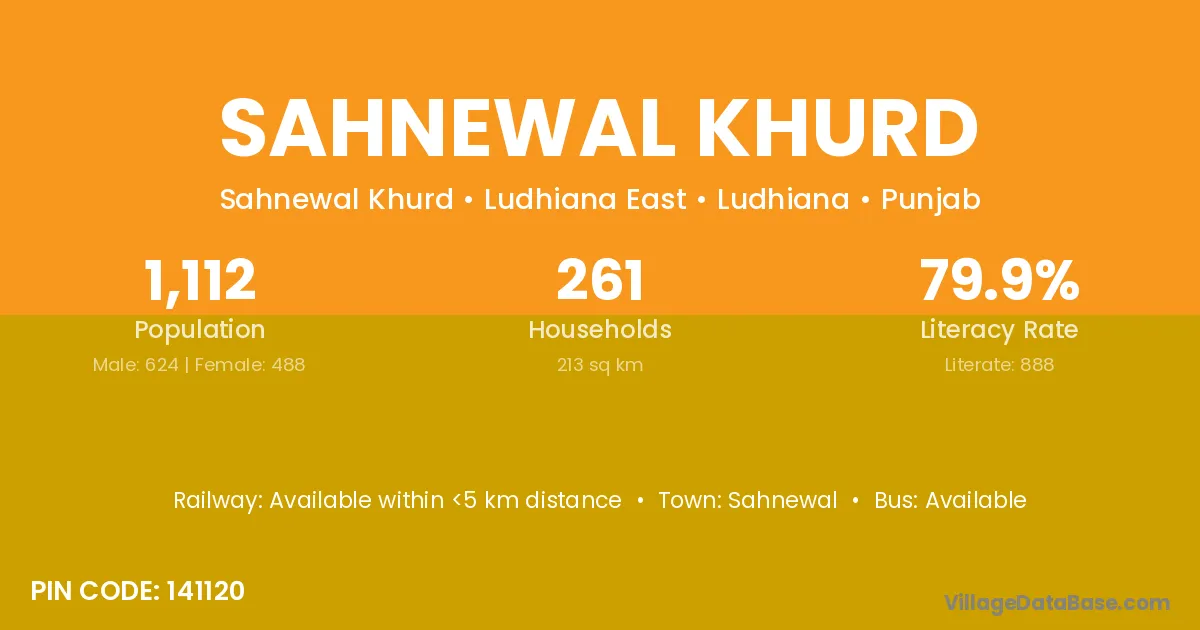 Sahnewal Khurd village has a total population of 1,112 people, of which 624 are males and 488 are females.