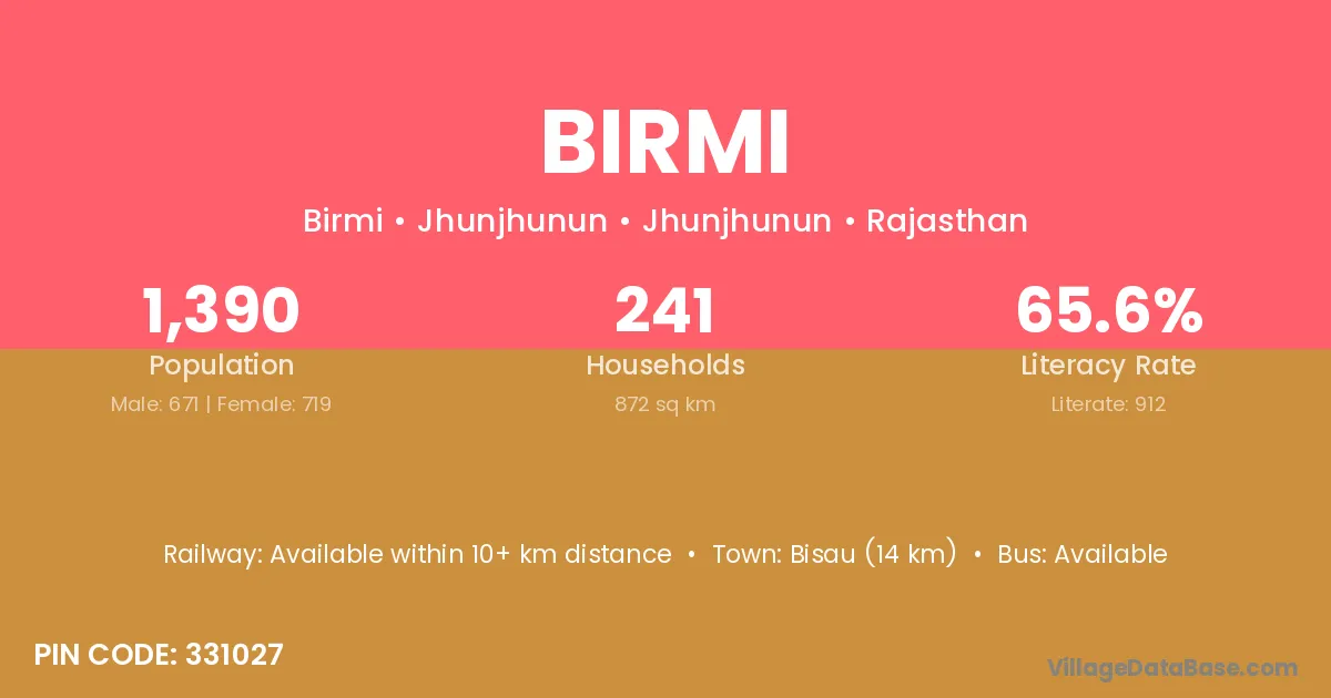 The literacy rate of Birmi village is 66.24%. Male literacy stands at 68.79% and female literacy at 63.54%.