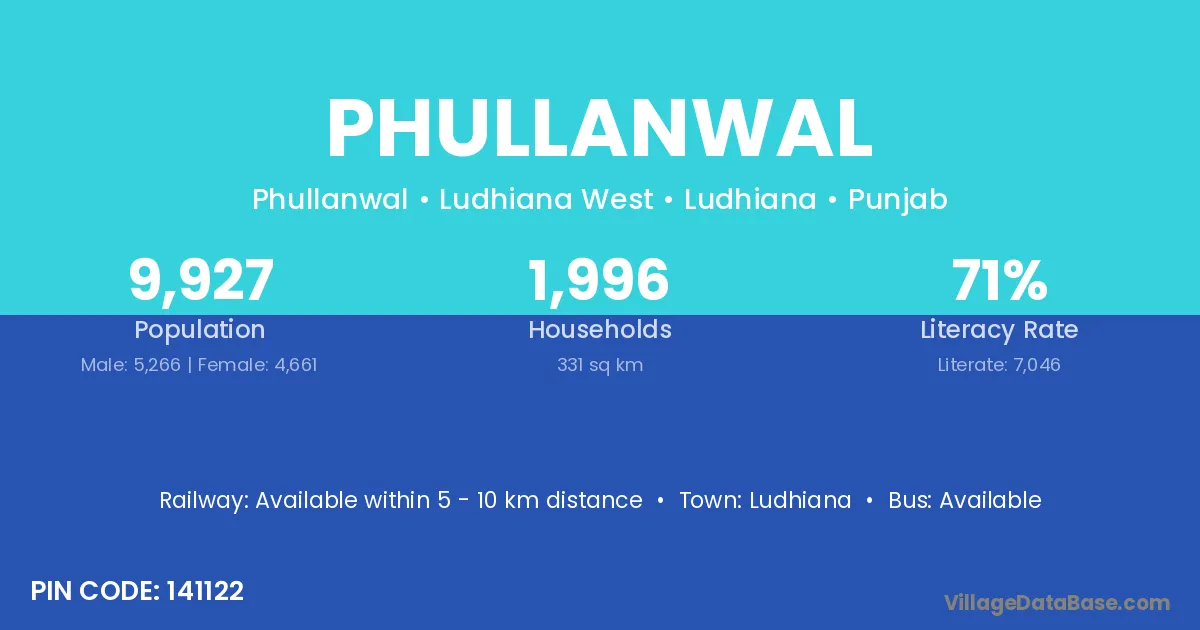 Phullanwal village has a total population of 9,927 people, of which 5,266 are males and 4,661 are females.
