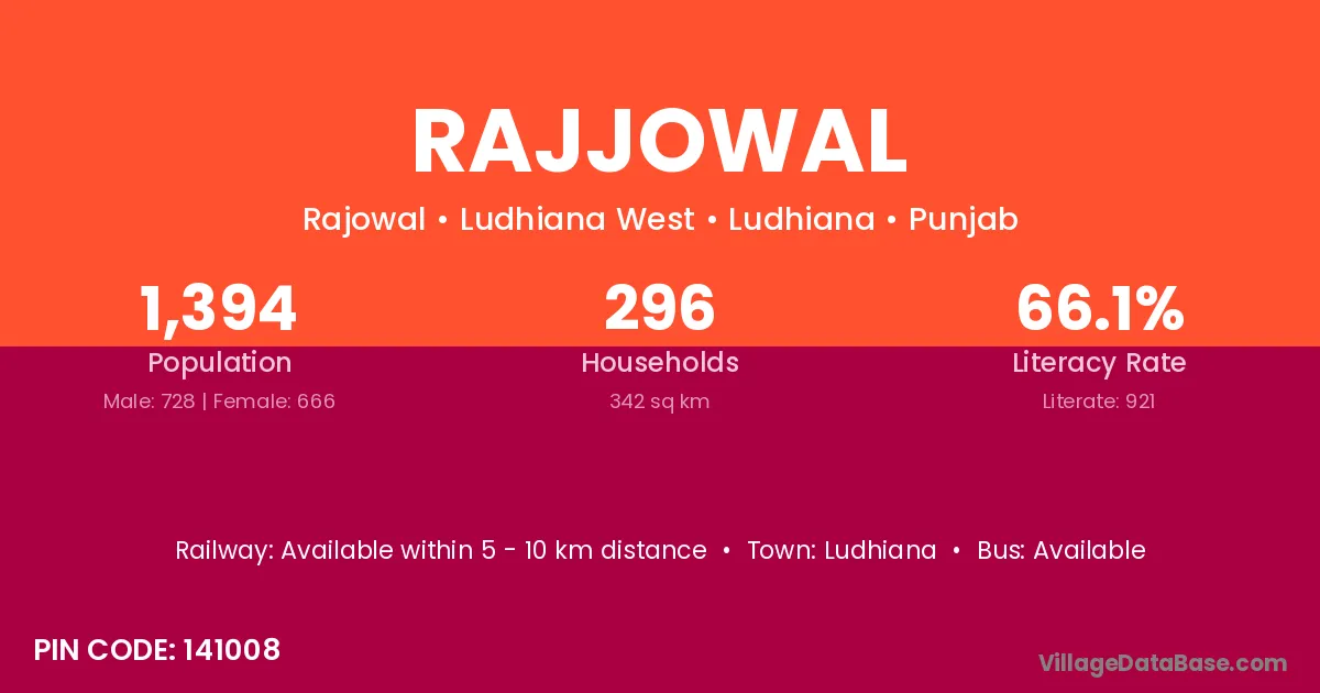 Rajjowal village has a total population of 1,394 people, of which 728 are males and 666 are females.