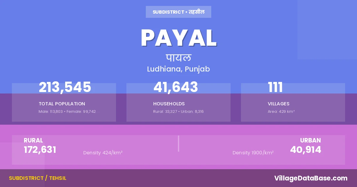 According to the 2011 census The total area of Payal Tehsil is 429 km², with a population of 213545 people. The population density is 498 inhabitants per square kilometre, and there are approximately 41643 houses in the sub district.