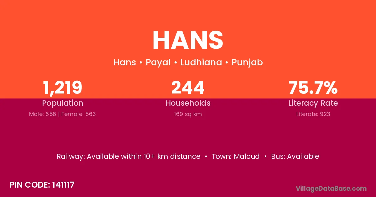 Hans village has a total population of 1,219 people, of which 656 are males and 563 are females.