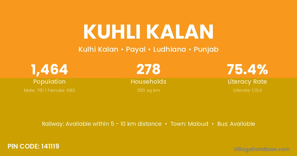 Kuhli Kalan village has a total population of 1,464 people, of which 781 are males and 683 are females.