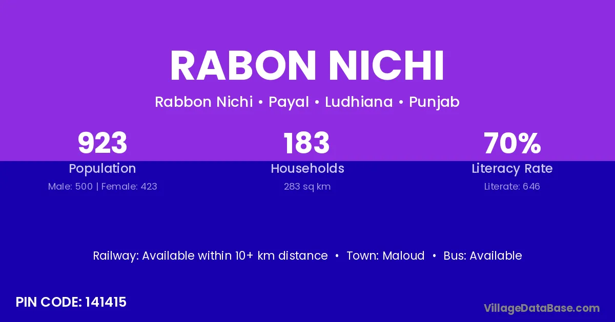 Rabon Nichi village has a total population of 923 people, of which 500 are males and 423 are females.