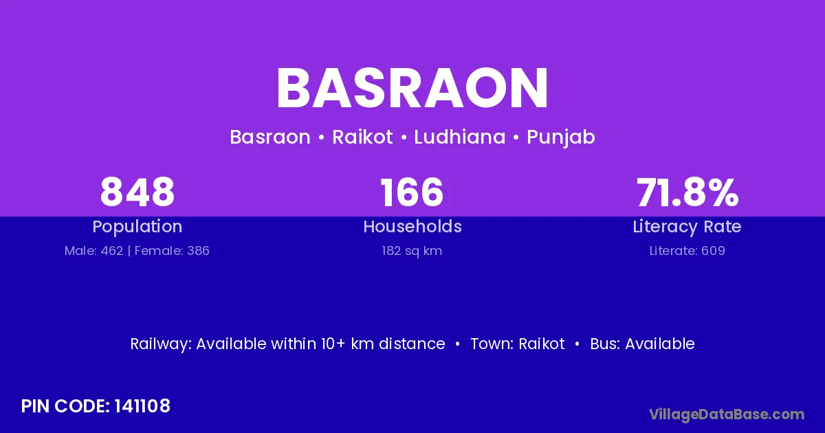 Basraon village has a total population of 848 people, of which 462 are males and 386 are females.