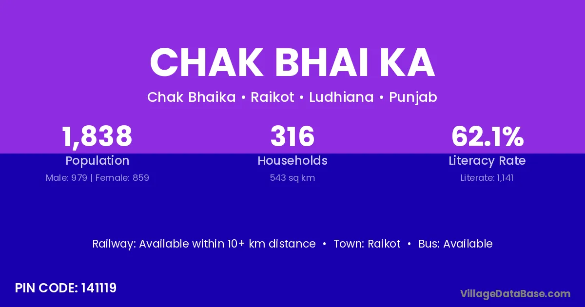 Chak Bhai Ka village has a total population of 1,838 people, of which 979 are males and 859 are females.