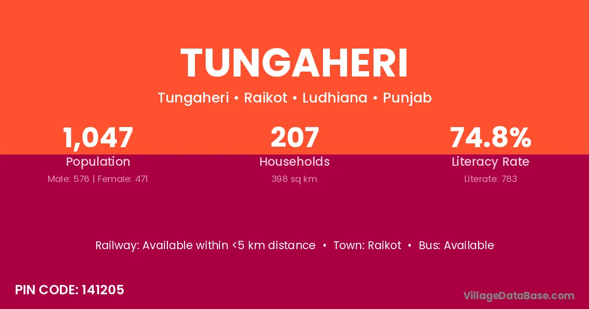 Tungaheri village has a total population of 1,047 people, of which 576 are males and 471 are females.