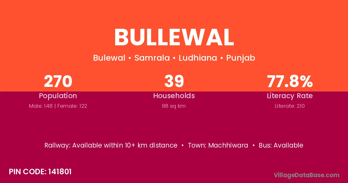 Bullewal village has a total population of 270 people, of which 148 are males and 122 are females.