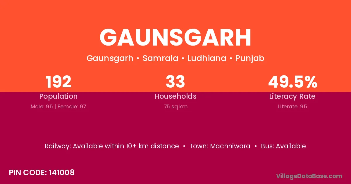 Gaunsgarh village has a total population of 192 people, of which 95 are males and 97 are females.