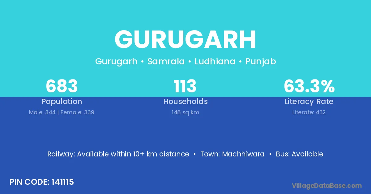 Gurugarh village has a total population of 683 people, of which 344 are males and 339 are females.