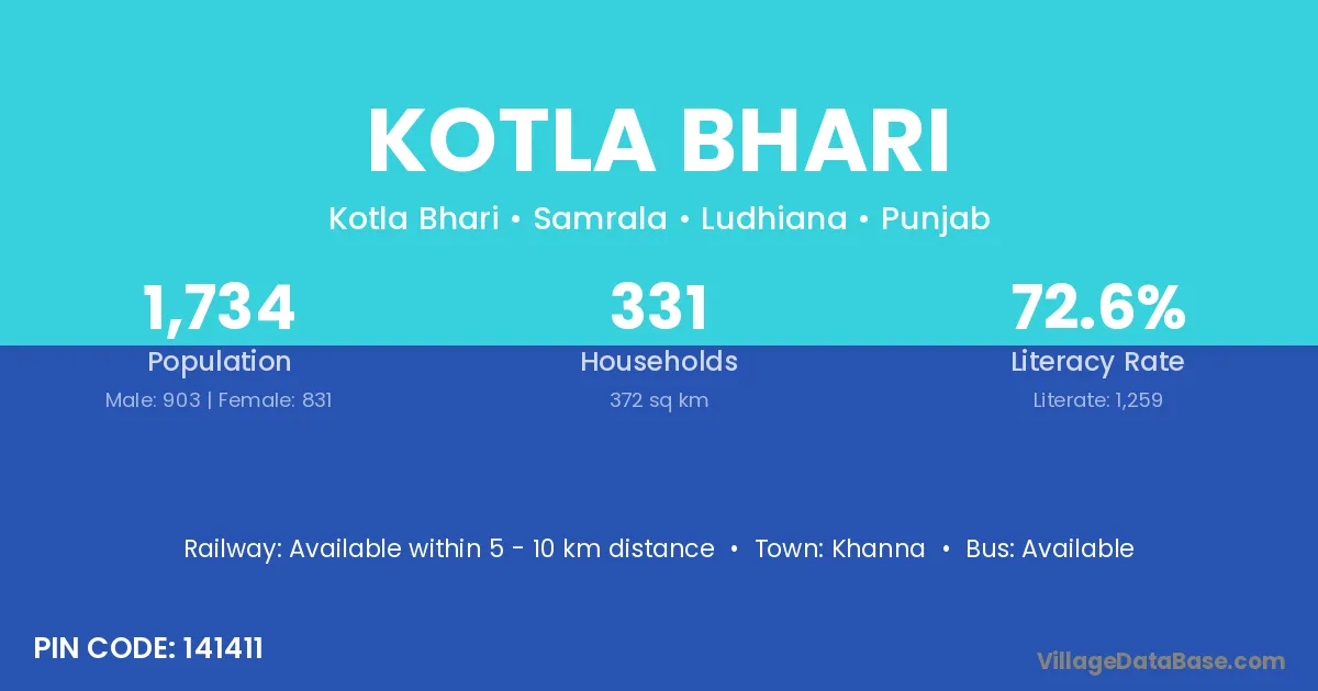 Kotla Bhari village has a total population of 1,734 people, of which 903 are males and 831 are females.