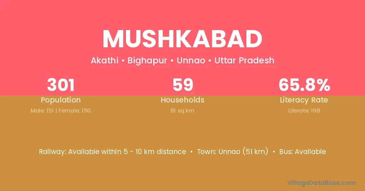 Mushkabad village has a total population of 1,858 people, of which 977 are males and 881 are females.