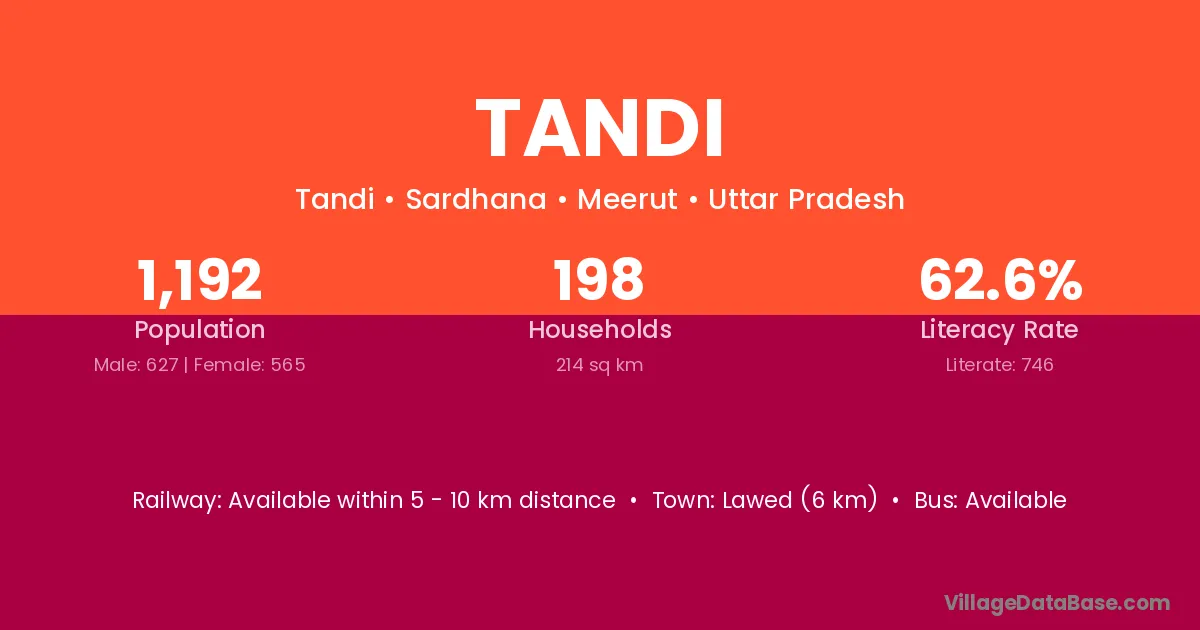 The literacy rate of Tandi village is 64.67%. Male literacy stands at 73.17% and female literacy at 54.41%.