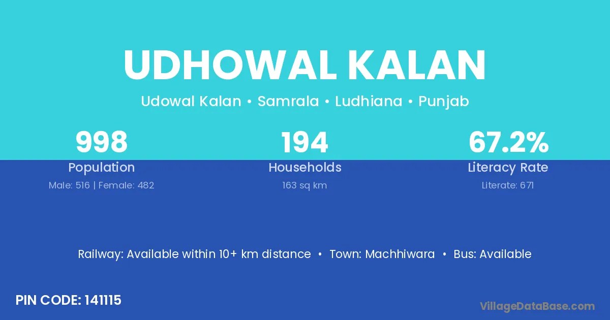 Udhowal Kalan village has a total population of 998 people, of which 516 are males and 482 are females.