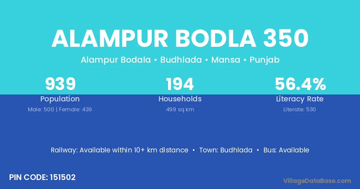 Alampur Bodla 350 village has a total population of 939 people, of which 500 are males and 439 are females.