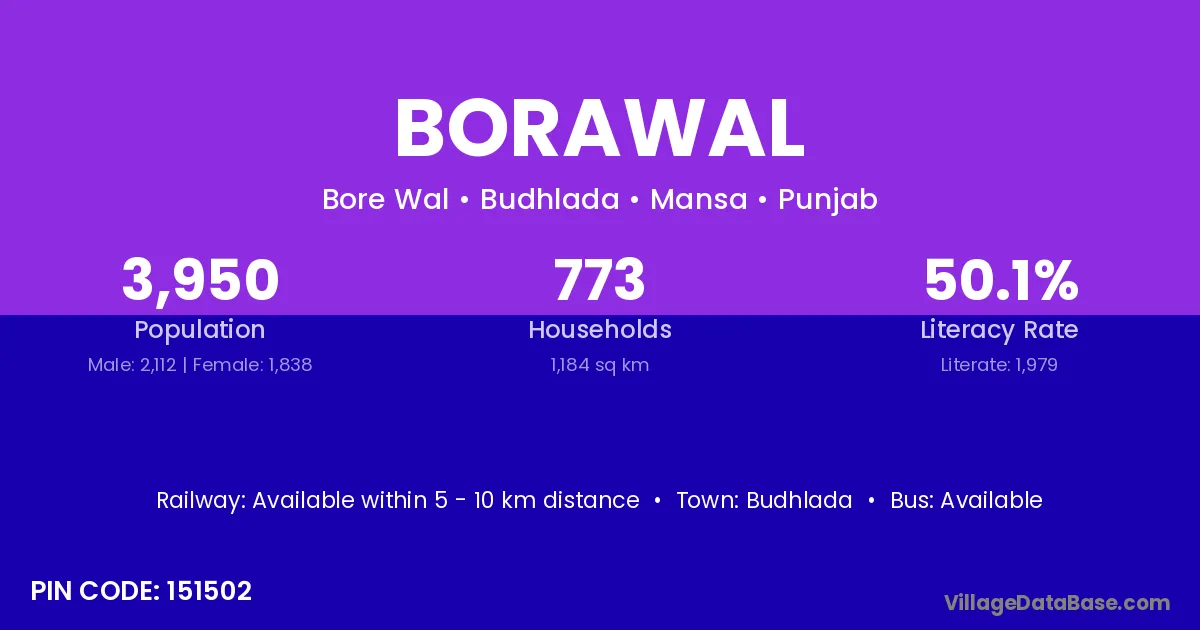 Borawal village has a total population of 3,950 people, of which 2,112 are males and 1,838 are females.