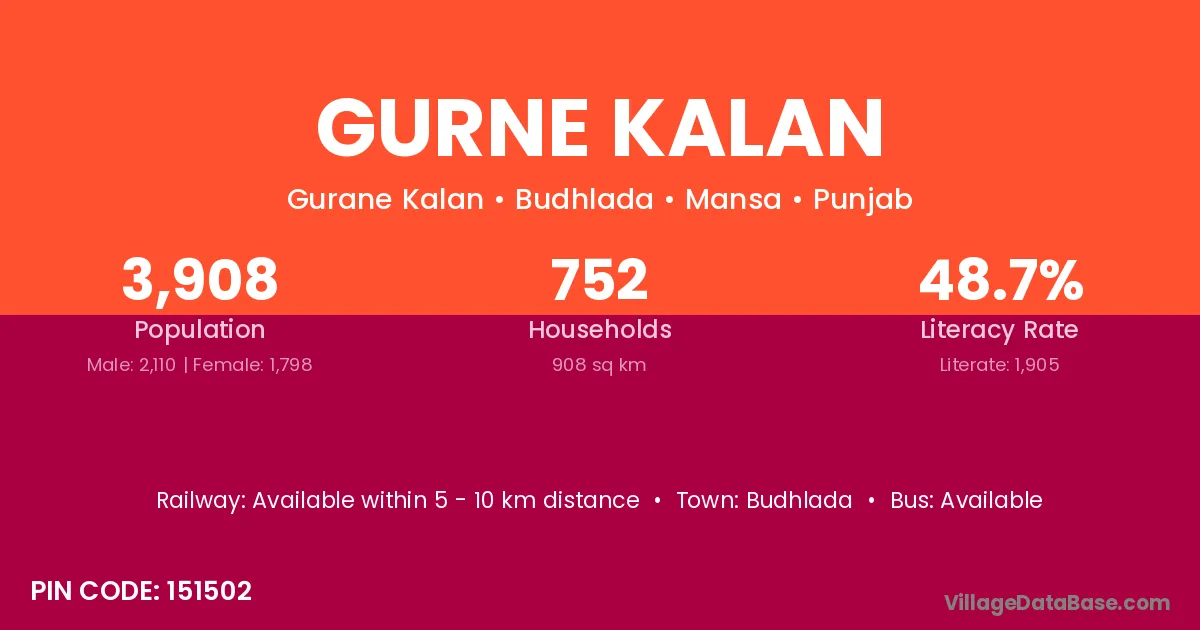 Gurne Kalan village has a total population of 3,908 people, of which 2,110 are males and 1,798 are females.