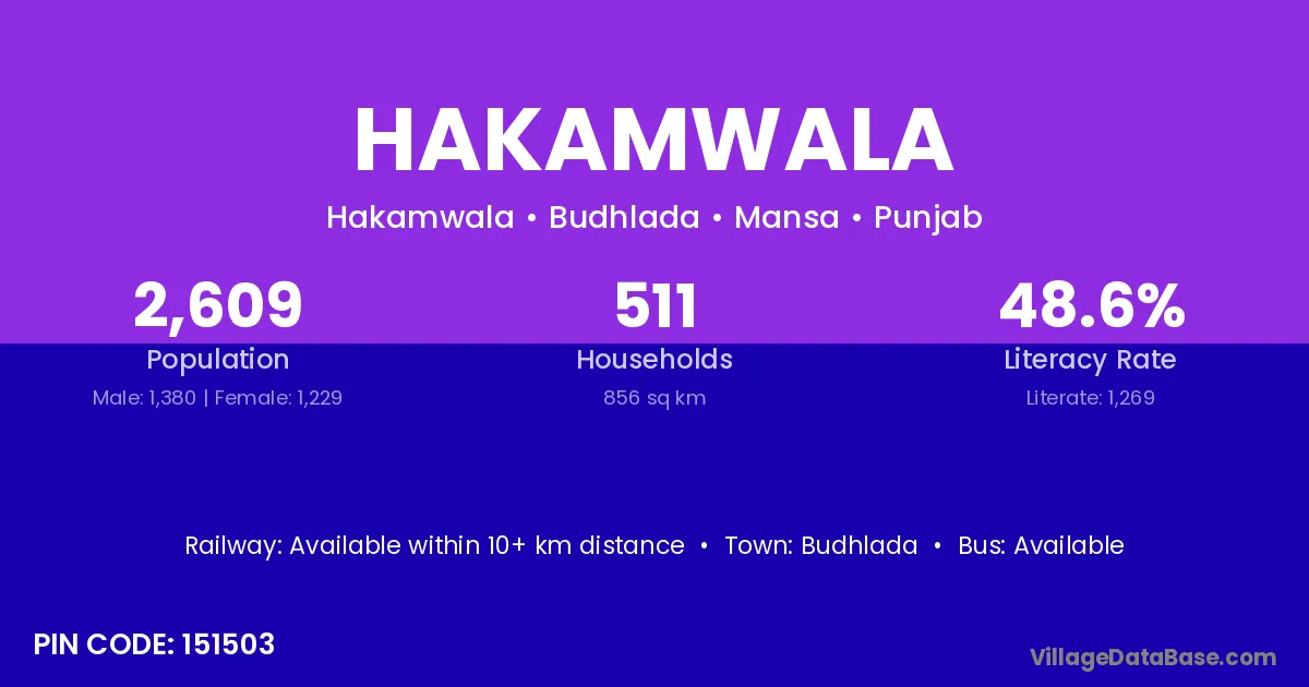 Hakamwala village has a total population of 2,609 people, of which 1,380 are males and 1,229 are females.
