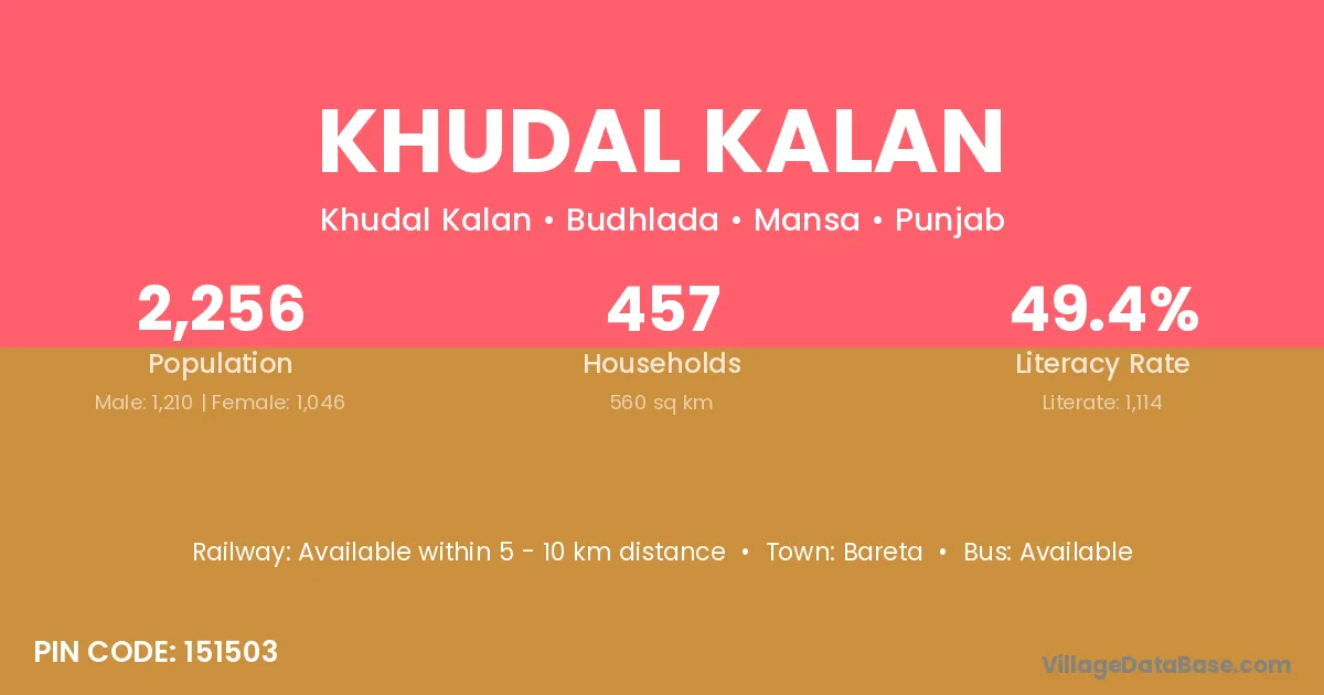 Khudal Kalan village has a total population of 2,256 people, of which 1,210 are males and 1,046 are females.