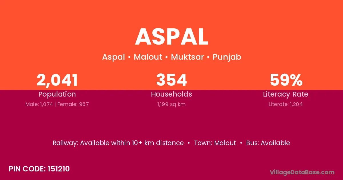 The literacy rate of Aspal village is 52.09%. Male literacy stands at 58.99% and female literacy at 44.33%.