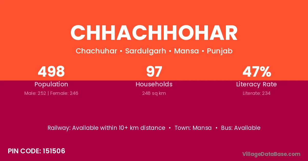 Chhachhohar village has a total population of 498 people, of which 252 are males and 246 are females.