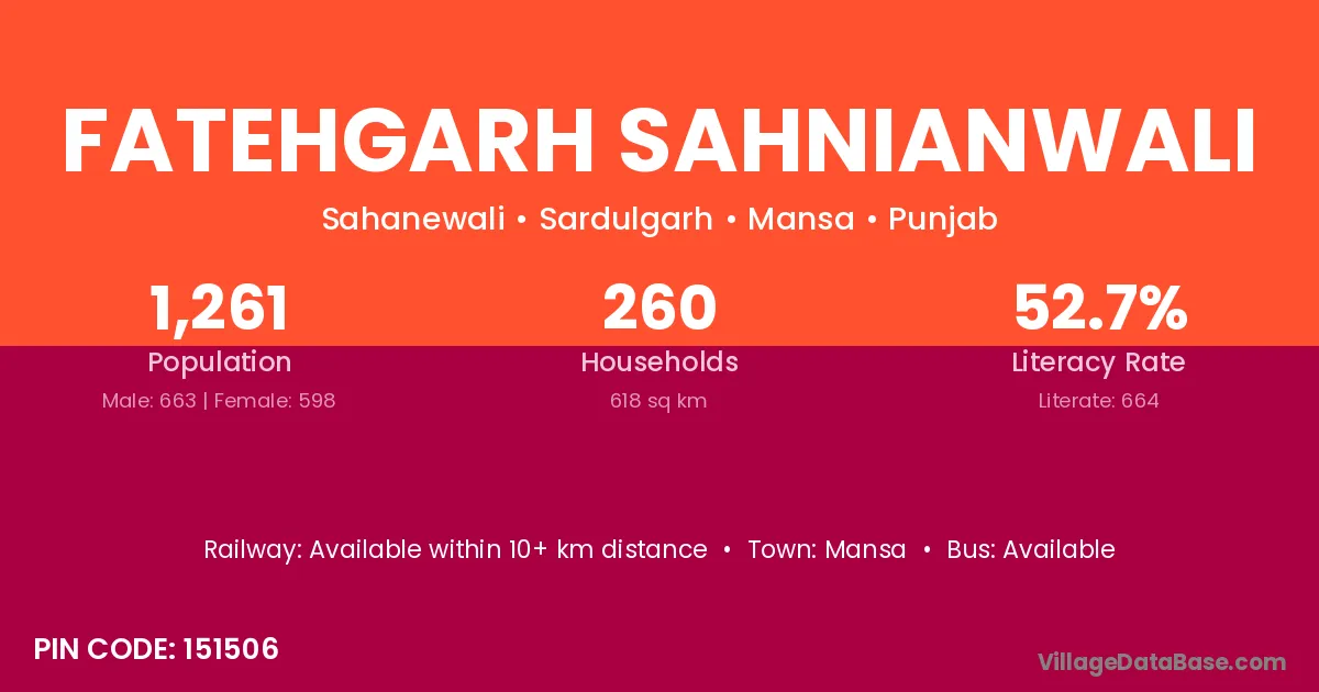 Fatehgarh Sahnianwali village has a total population of 1,261 people, of which 663 are males and 598 are females.