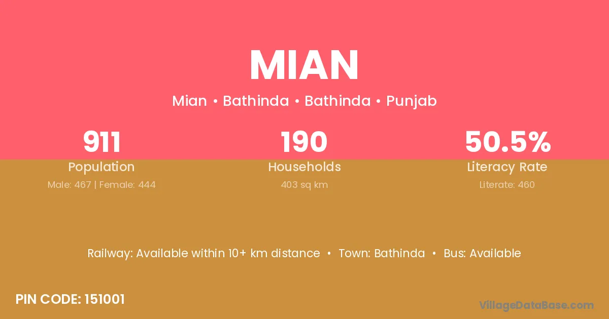 According to Census 2011 information, the village code of Mian village is 151506.