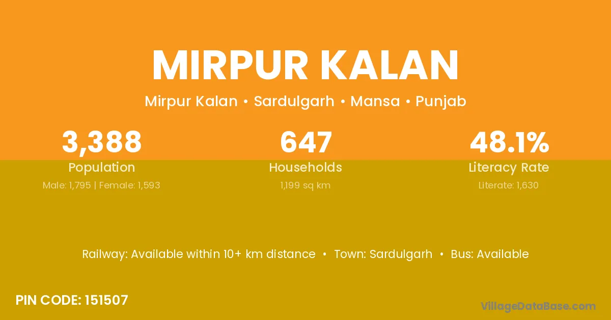 Mirpur Kalan village has a total population of 3,388 people, of which 1,795 are males and 1,593 are females.