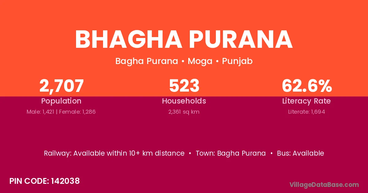 Bhagha Purana village has a total population of 2,707 people, of which 1,421 are males and 1,286 are females.