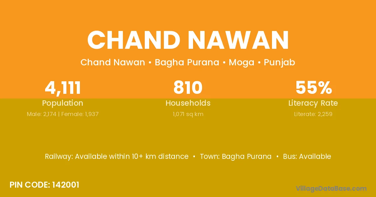 Chand Nawan village is located in the Bagha Purana Tehsil of the Moga district in Punjab .