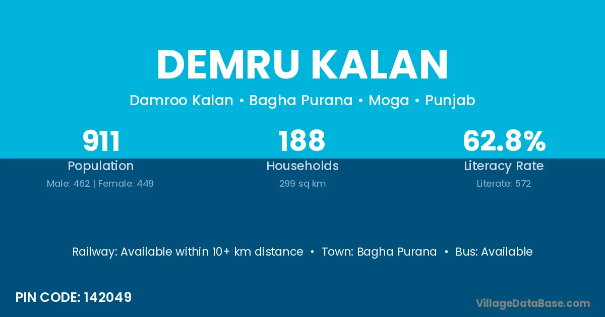 Bagha Purana is the nearest town to Demru Kalan village for major economic activities