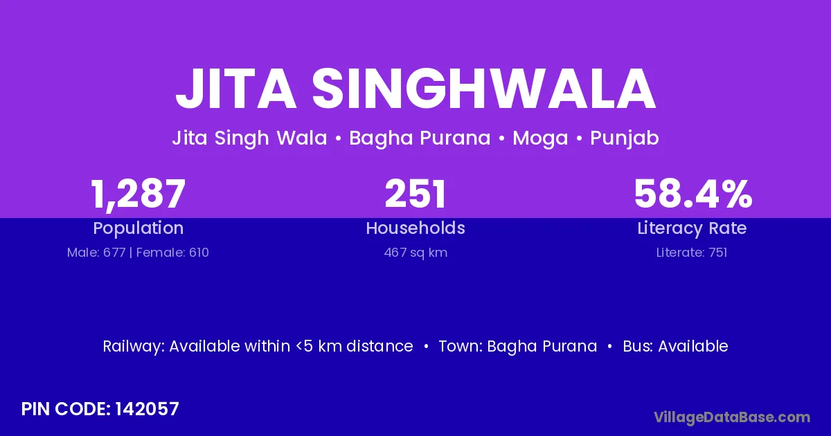 Jita Singhwala village has a total population of 1,287 people, of which 677 are males and 610 are females.