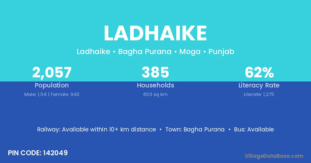 Ladhaike village is located in the Bagha Purana Tehsil of the Moga district in Punjab .
