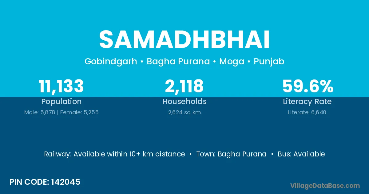 Samadhbhai village is located in the Bagha Purana Tehsil of the Moga district in Punjab .