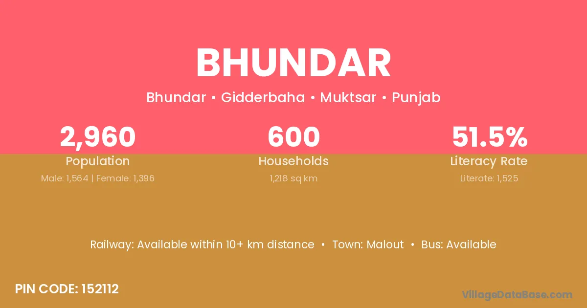 Bhundar village has a total population of 2,960 people, of which 1,564 are males and 1,396 are females.