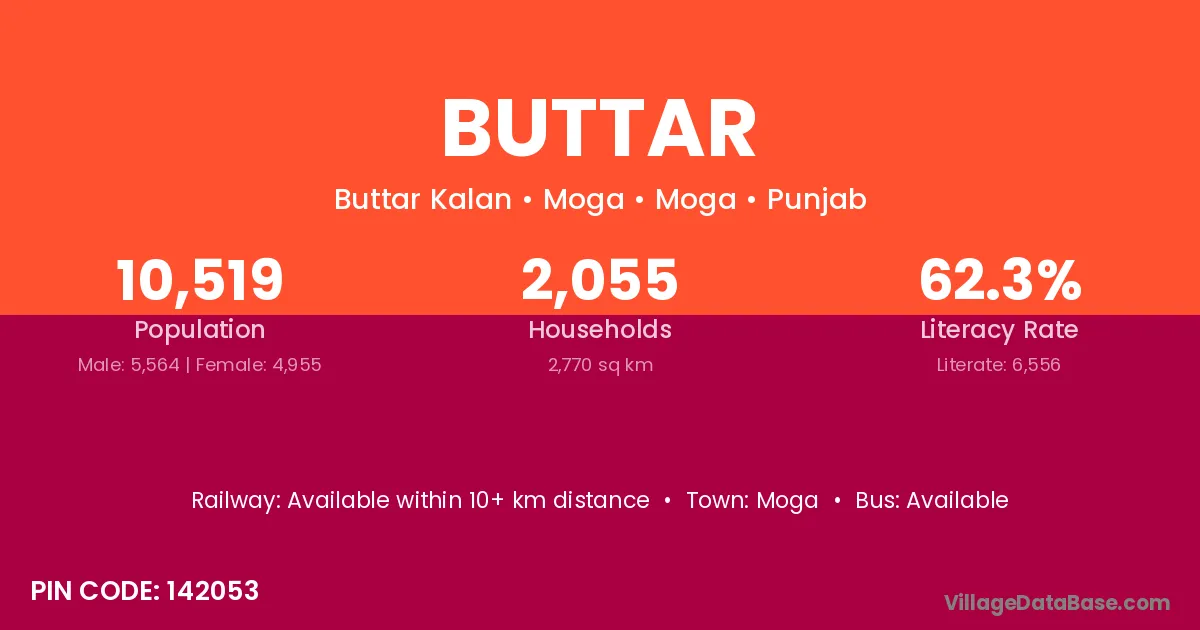 The literacy rate of Buttar village is 56.71%. Male literacy stands at 62.30% and female literacy at 50.49%.