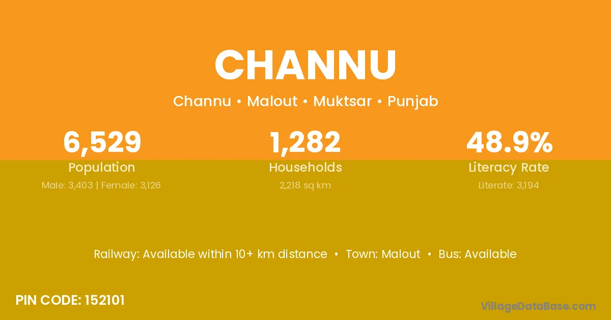 Channu village has a total population of 6,529 people, of which 3,403 are males and 3,126 are females.
