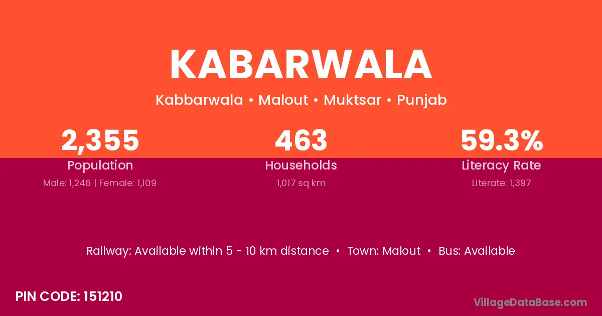 Kabarwala village has a total population of 2,355 people, of which 1,246 are males and 1,109 are females.
