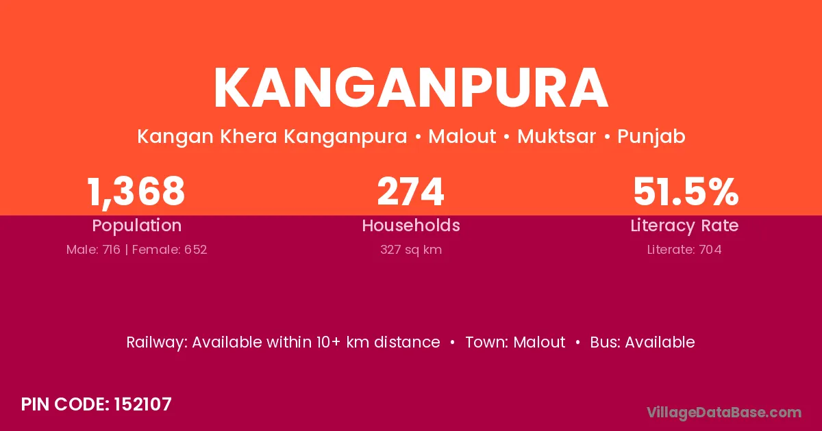 Kanganpura village has a total population of 1,368 people, of which 716 are males and 652 are females.