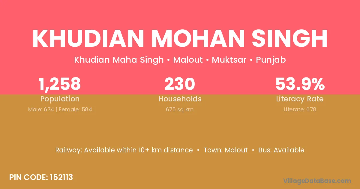 Khudian Mohan Singh village has a total population of 1,258 people, of which 674 are males and 584 are females.