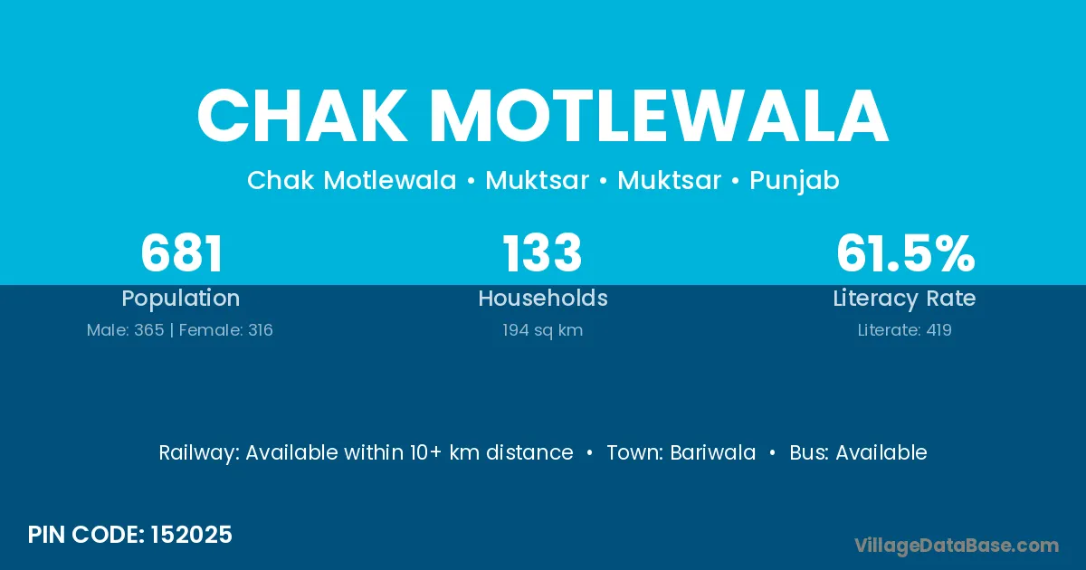 Chak Motlewala village has a total population of 681 people, of which 365 are males and 316 are females.