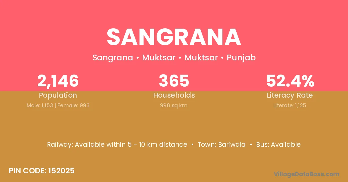 Sangrana village has a total population of 2,146 people, of which 1,153 are males and 993 are females.