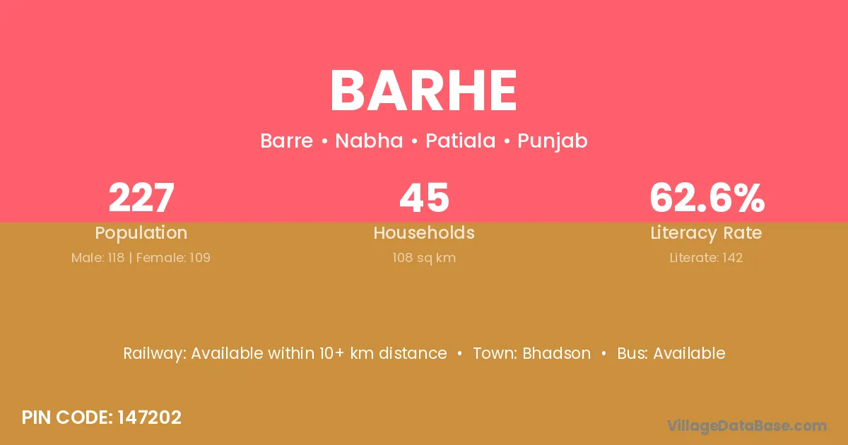 Barhe village has a total population of 227 people, of which 118 are males and 109 are females.